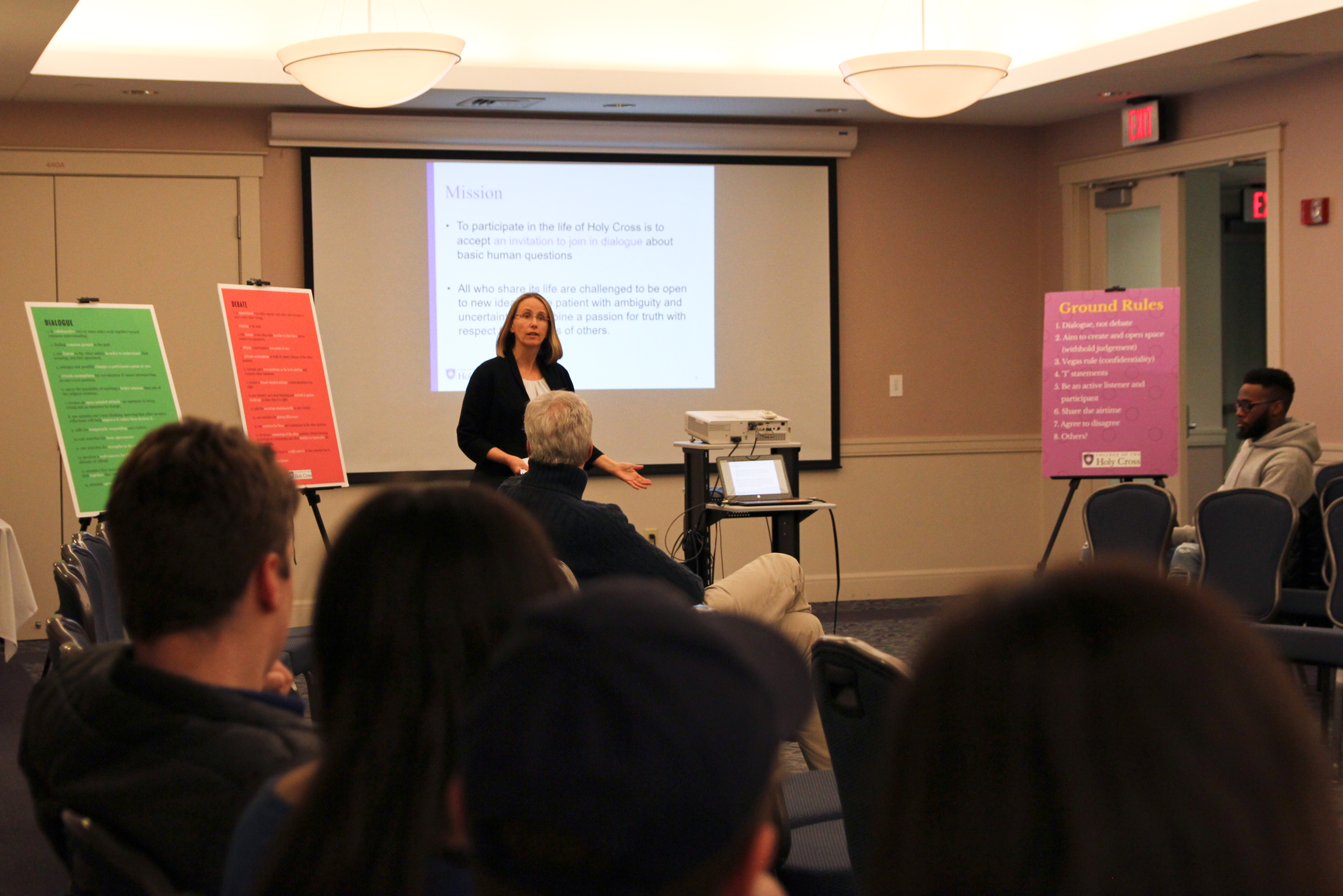 Elizabeth Small, general counsel to the College, then took over with a detailed presentation on the differences between freedom of expression and freedom of speech, and the complicated legalities of speech and expression at private institutions like Holy Cross. Small acknowledged how difficult it can be to accept that even some hateful speech is technically legal, but implored those made uncomfortable by that to consider how important it is to have discussions about why that speech exists and what can be done about it.