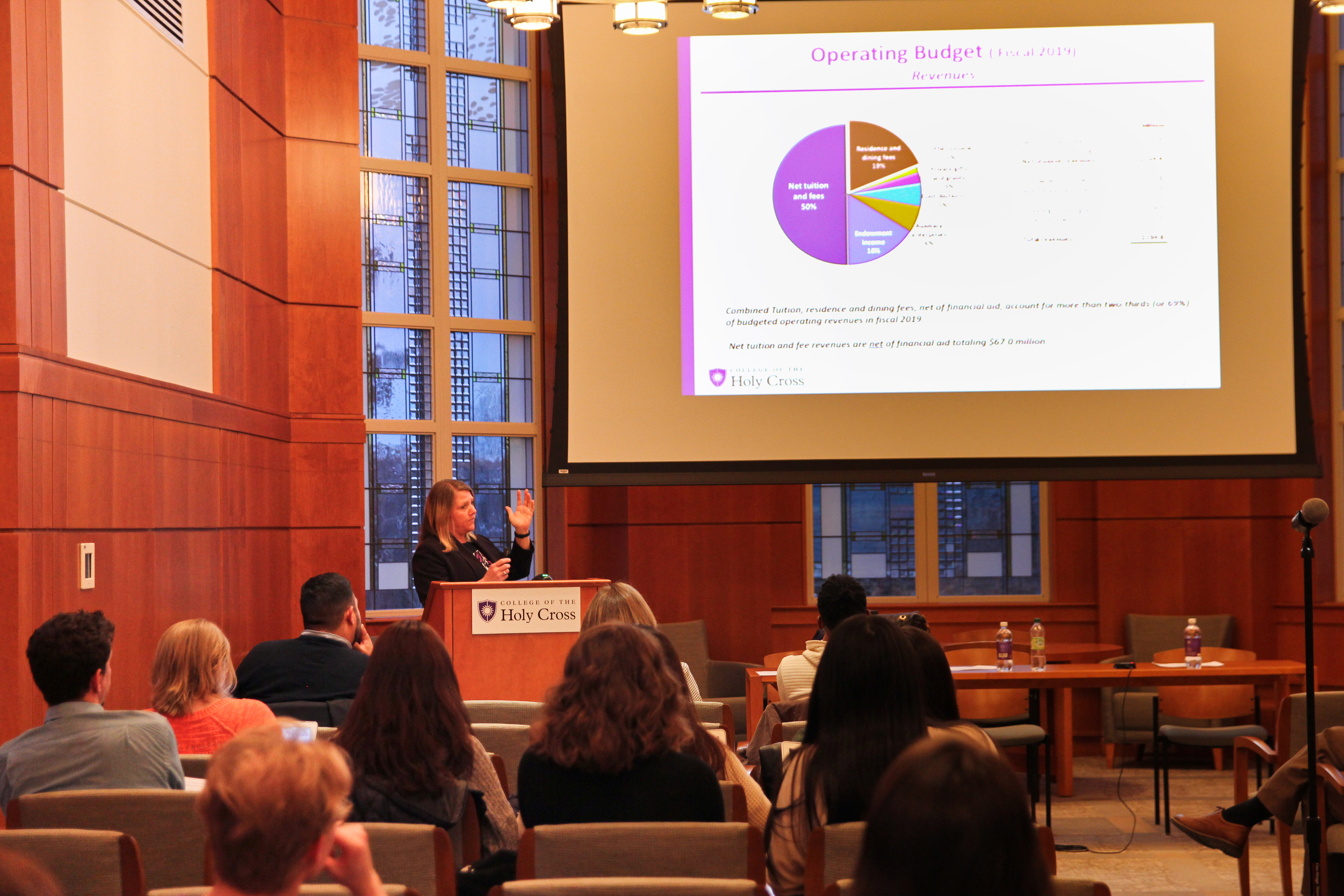 She provided a brief overview of the various sources from which the College gets its money and of how that money is spent. She detailed the College’s operating budget, of which $97.4 million, or about 50 percent, comes from net tuition and fees. She also displayed a chart depicting Holy Cross’ tuition and room and board changes in comparison with other educational institutions that are structured similarly to Holy Cross, which showed that Holy Cross is only about 300 dollars more expensive than the median institution on the chart.