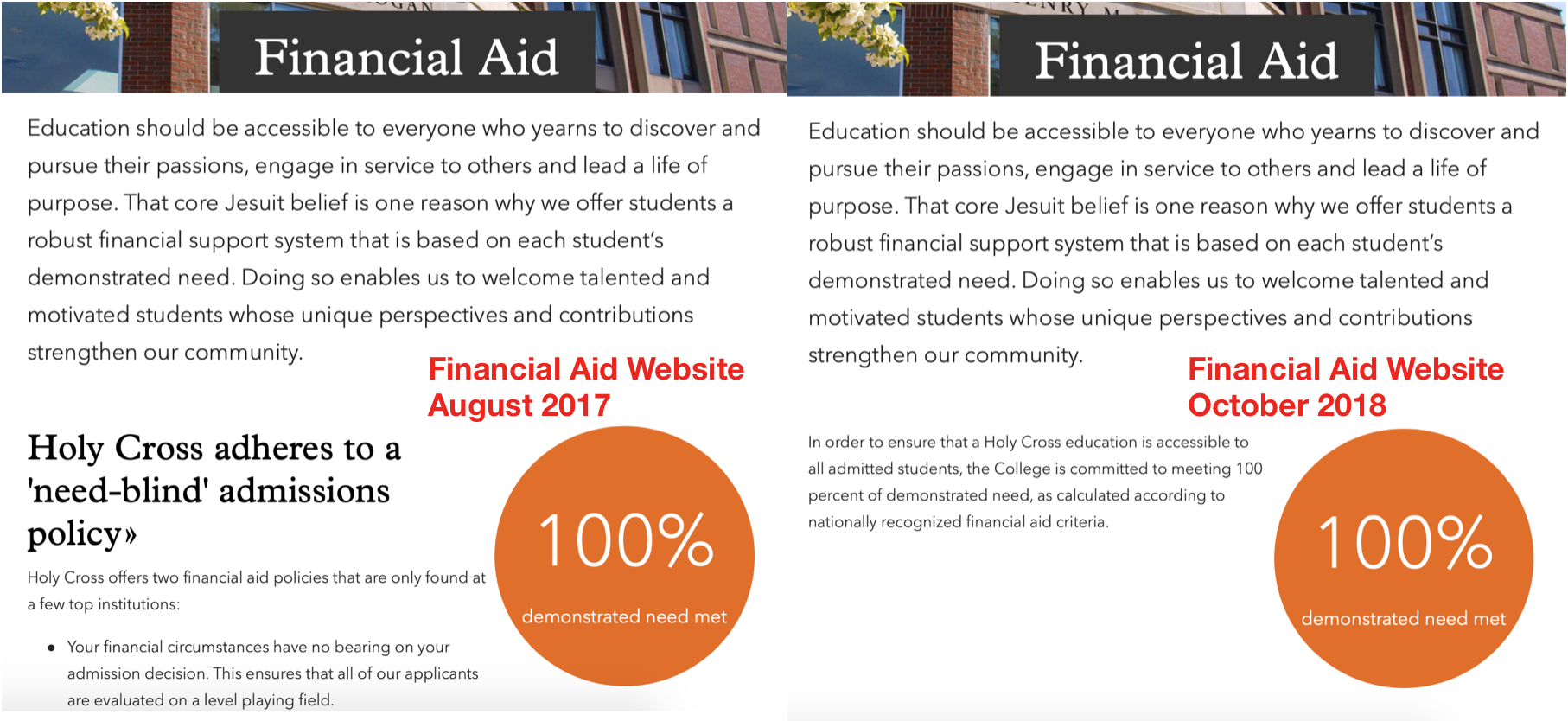 Only a handful of universities across the nation have the privilege of claiming that their college admissions practices are both need-blind––meaning that they do not take an applicant’s financial standing into account in admissions decisions––and that they meet full demonstrated financial need of the applicant––be that through loans, work study, or grants. In accordance to their Jesuit beliefs, the College of the Holy Cross proudly counted themselves among these elite few schools until this academic year.