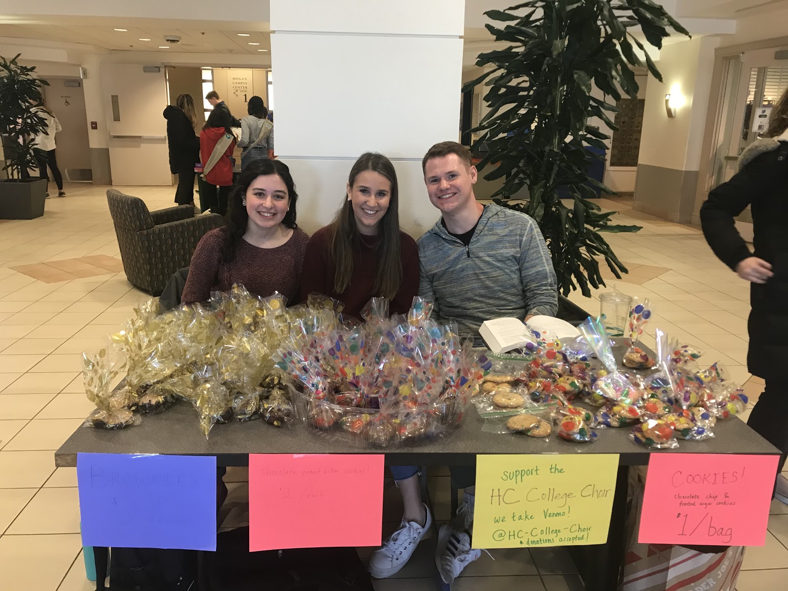 On Monday, February 17, at 11:00 a.m., a booth was set up in Hogan 1 with brownies and cookies available for students with a sweet tooth. Staffed by members of the Holy Cross College Choir and Chamber Singers, the booth was the first fundraising event for the choirs this year. The money raised will go toward an exciting long-term goal for the group: the Choir and Chamber Singers plan on touring in Italy during next year’s spring break! Planning for this tour began last semester, and this bake sale is only the first of many fundraising events slated for the remainder of this year as well as next semester as the group prepares for this daring step.